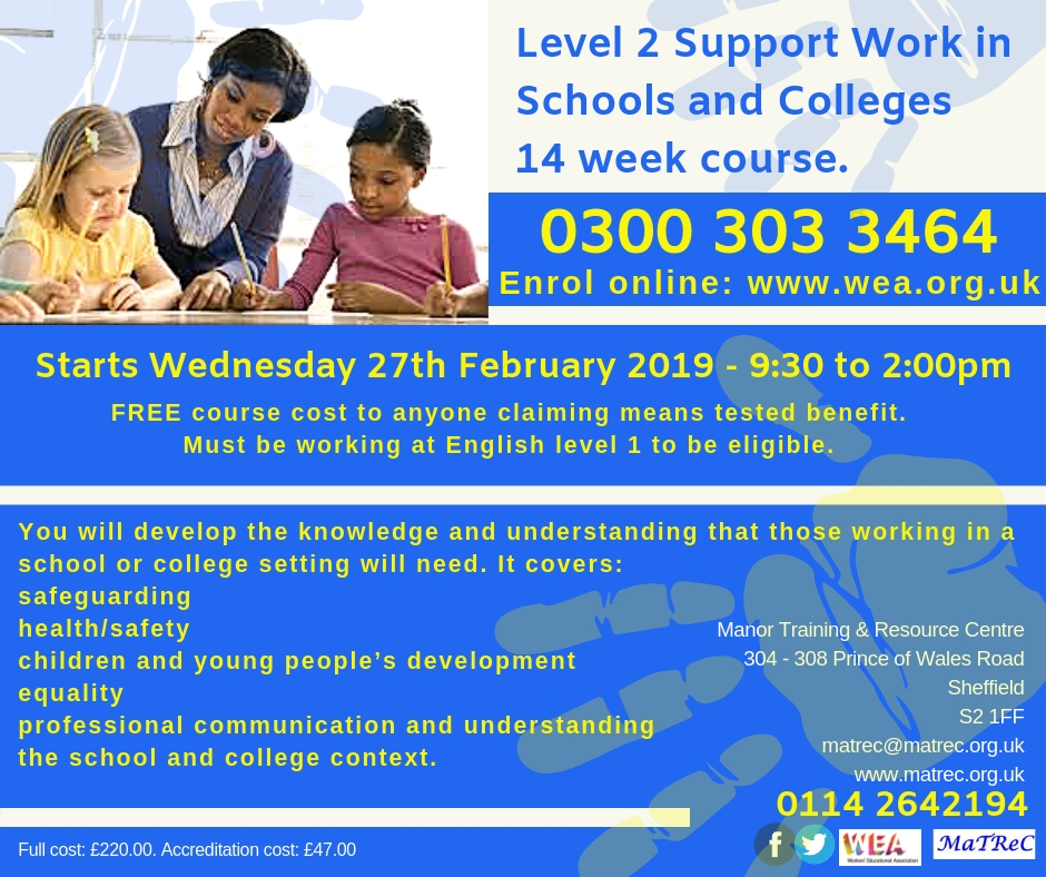Manor Training and Resource Centre (MaTReC) is seeking registrations for its upcoming Level 2 Support Work in Schools and Colleges course.