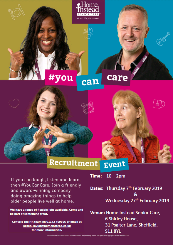 Sheffield-based Home Instead Senior Care is to stage two recruitment events on Thursday 7th February and Wednesday 27th February as the company looks to fill a number of vacancies.