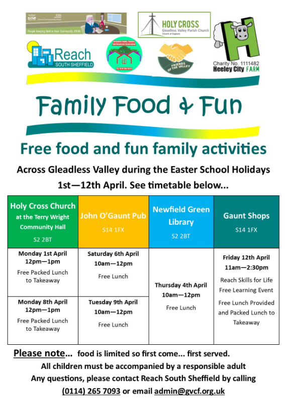 A series of community events are taking place in Gleadless Valley during the upcoming Easter holidays, across venues including Holy Cross Church, John O’Gaunt Pub, Newfield Green Library and Gaunt Shops.