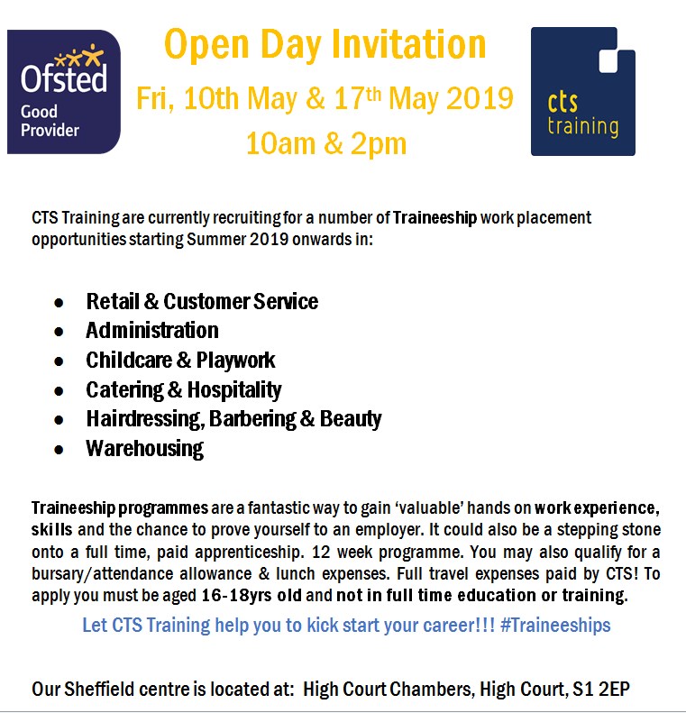 CTS Training is to run Traineeship Open Days every Friday at its Sheffield Centre starting from May 2019 through to the end of August 2019.