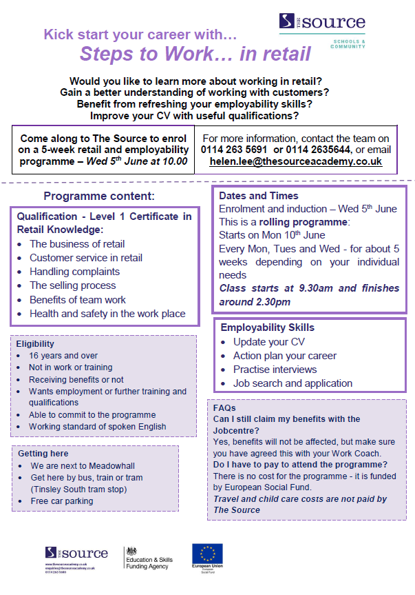 The Source is staging an enrolment day for its Steps to Work in Retail employability programme on Wednesday 5th June.