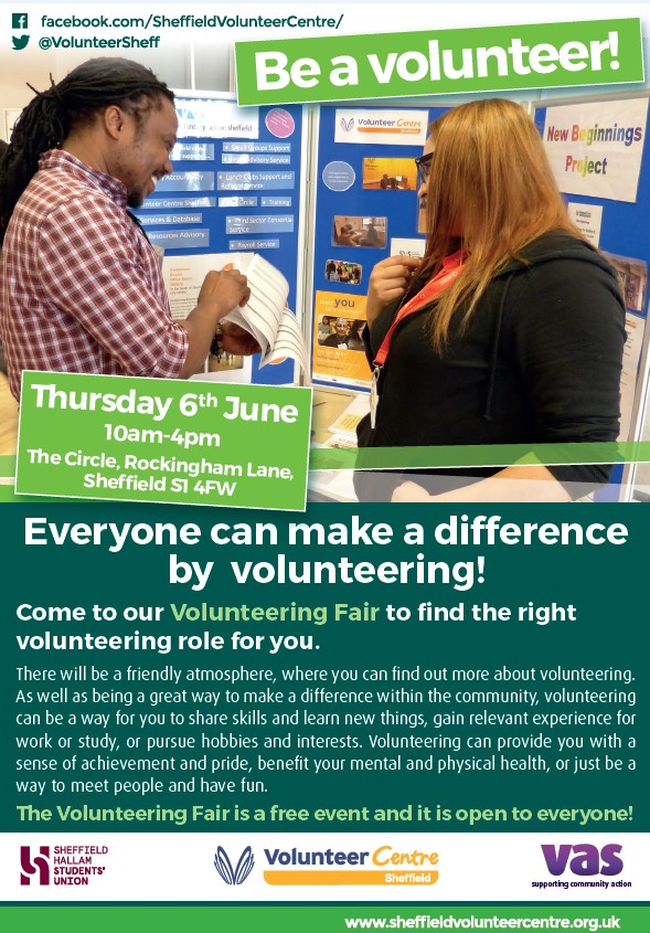 Sheffield Volunteer Centre’s next Volunteering Fair is on Thursday 6th June at The Circle, from 10am-4pm.