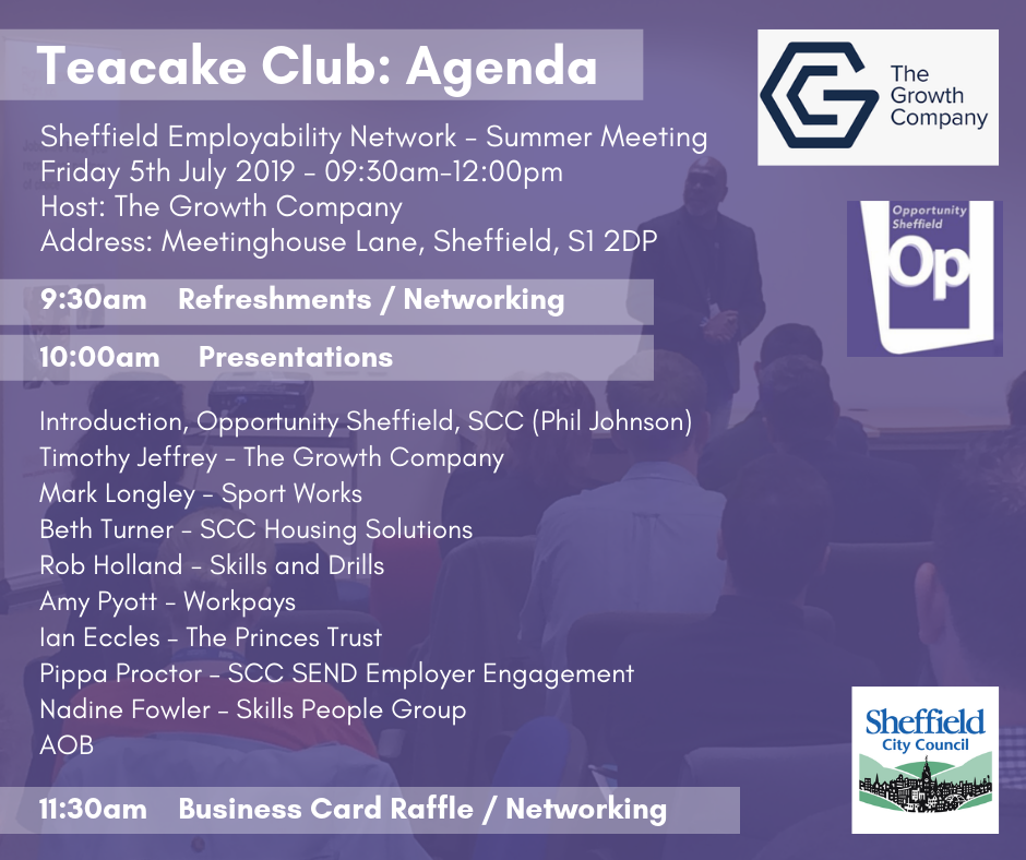 Please see below for the agenda for this week’s meeting of the Teacake Club (Sheffield Employability Network), which takes place from 9:30am at The Growth Company.