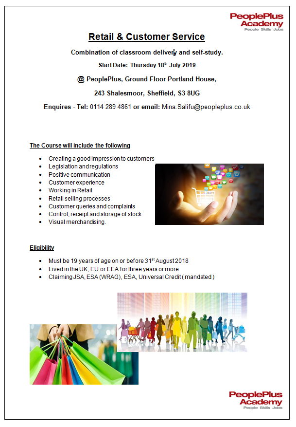 PeoplePlus Academy has a Retail & Customer Service course starting at Portland House on Thursday 18 July.