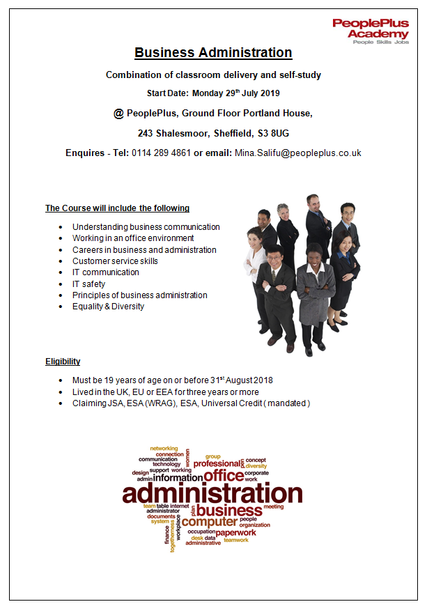 PeoplePlus Academy is to run a Business Administration Course starting at the end of July (Level 1 – Level 2).