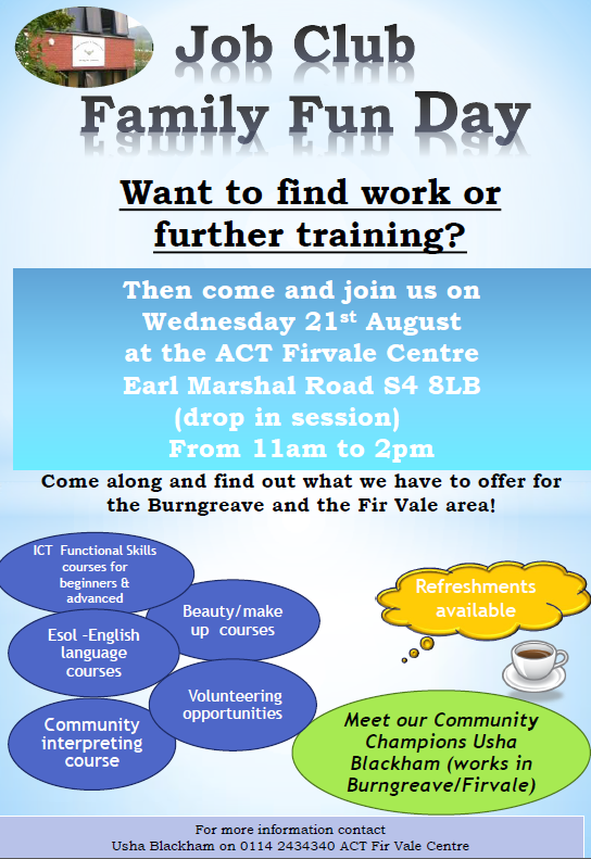 Aspiring Communities Together (ACT) is organising a Job Club Family Fun Day, to take place at ACT Firvale Centre, Earl Marshall Road, S4 8LB on Wednesday 21 August.