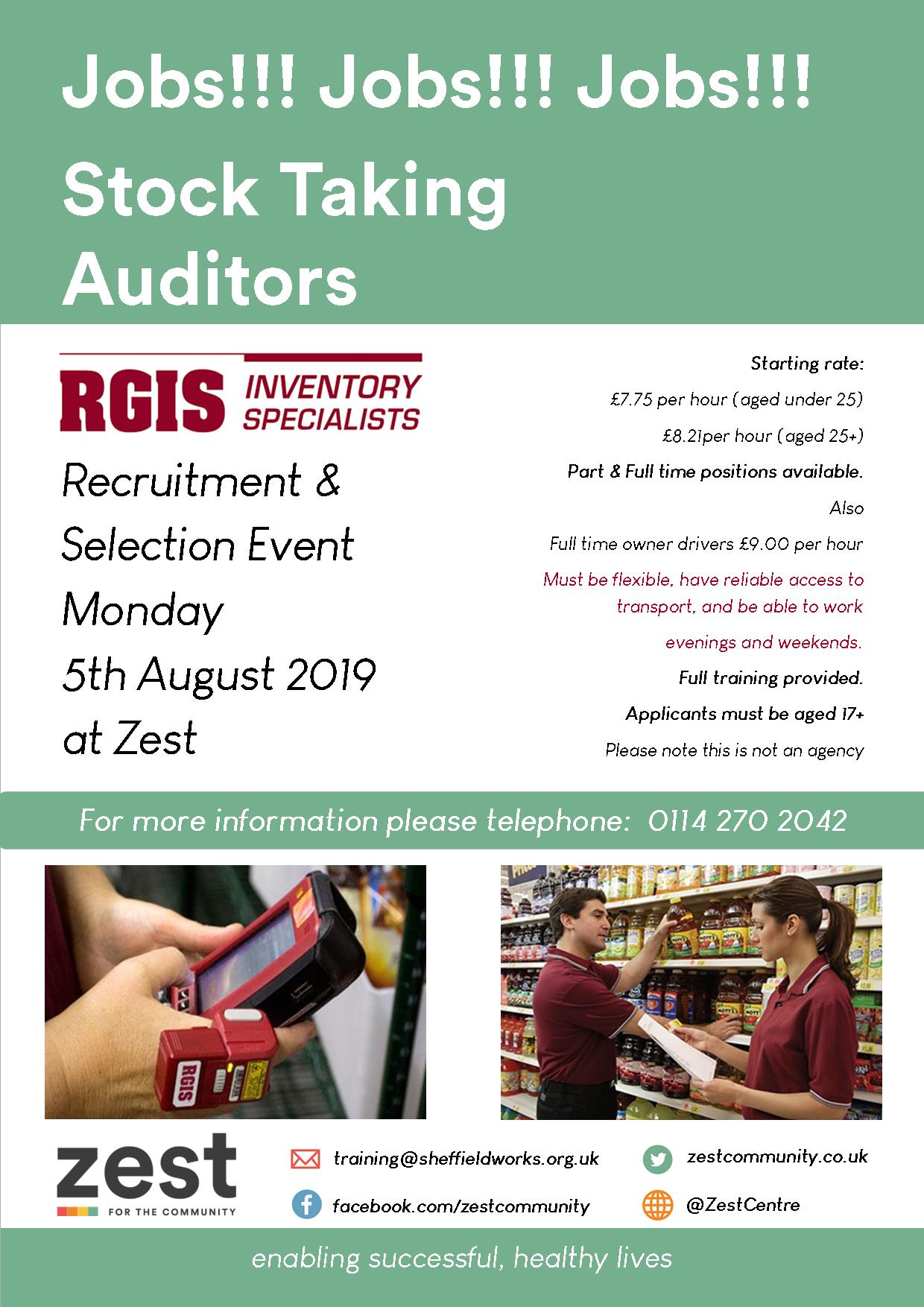 Zest is holding recruitment day with RGIS on Monday 5 August to recruit a number of people for permanent stocktaking roles. Please promote to your customers; anyone that is interested must have a pre-booked appointment.