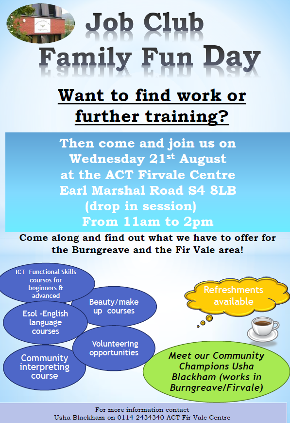 A Job Club Family Fun Day will take place at ACT Firvale Centre, Sheffield, on Wednesday 21 August.