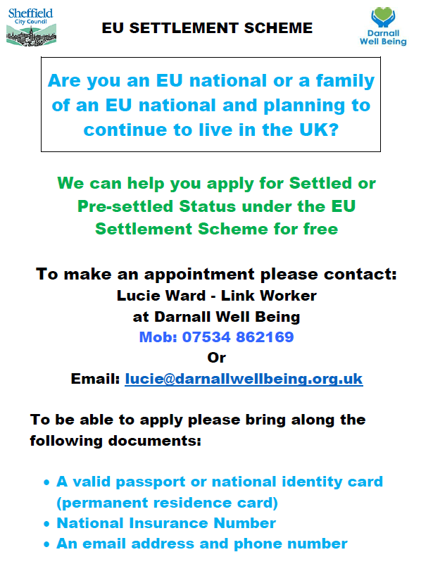 EU Settlement Scheme – assistance available through Darnall Well Being Opportunity Darnall Well Being August 29, 2019 1 Minute Darnall Well Being is offering EU nationals and their families support applying for the EU Settlement Scheme. Share this: Click to share on X (Opens in new window) X Click to share on Facebook (Opens in new window) Facebook Like Loading... Related Published August 29, 2019