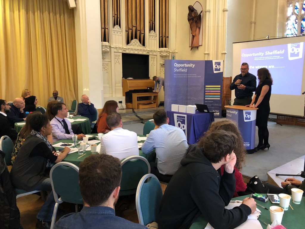The event began with an ice-breaker – with each of the 12 tables challenged to build a high tower out of marshmallow and spaghetti – before Laura Hayfield, Acting Head of Employment & Skills at Sheffield City Council, provided an overview of Opportunity Sheffield activity. She discussed the achievements of the Council’s employment and skills service, in terms of people engaged and the number of people supported into jobs, apprenticeships, training and work placements.
