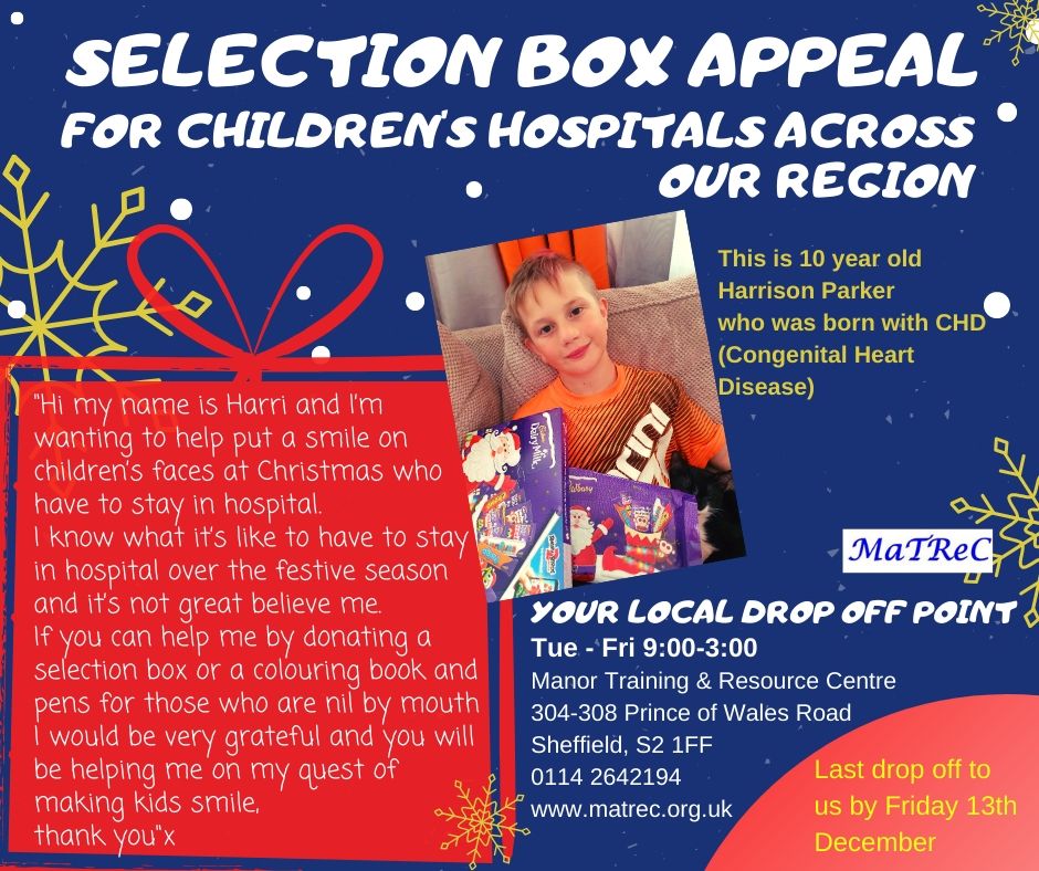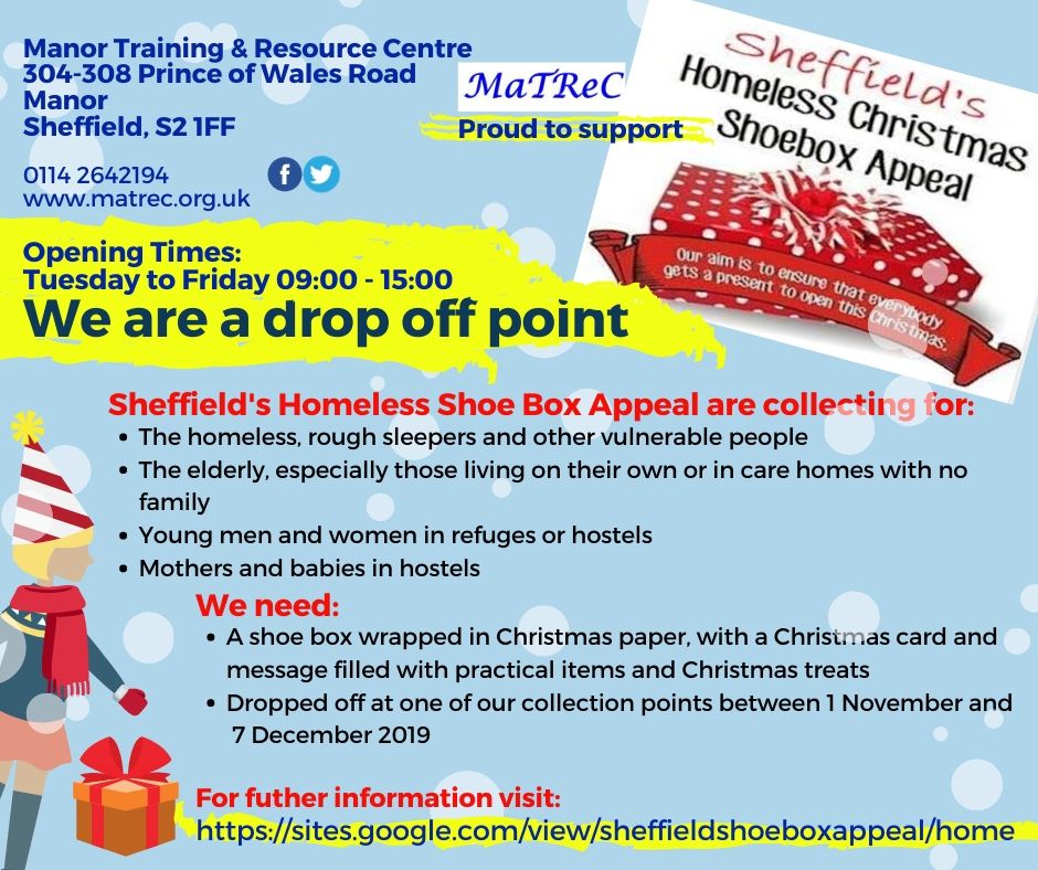 Manor Training and Resource Centre is proud to be supporting Sheffield’s Homeless Christmas Shoebox Appeal – for which it is a drop-off centre – and the childrens’ hospitals’ Selection Box appeal.