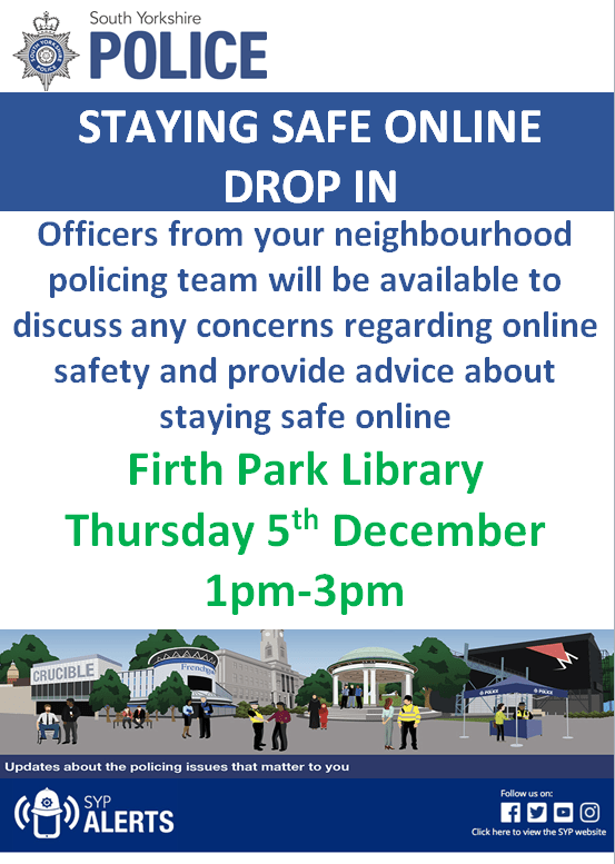 Staying Safe Online Drop-in with SYP at Firth Park Library – Thurs 5 Dec Opportunity Miscellaneous December 4, 2019 1 Minute South Yorkshire Police is staging a Staying Safe Online Drop-In event on Thursday 5 December at Firth park Library. Share this: Click to share on X (Opens in new window) X Click to share on Facebook (Opens in new window) Facebook Like Loading... Related Published December 4, 2019