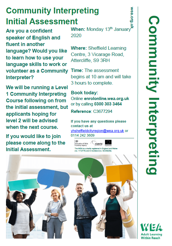 WEA is running a Level 1 Community Interpreting Course at Sheffield Learning Centre in Attercliffe in the new year.