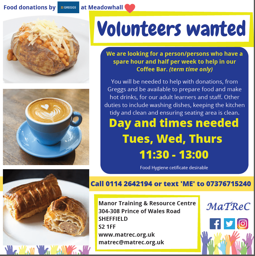 Manor Training and Resource Centre has volunteers to help in its coffee bar on Tuesdays, Wednesdays and Thursdays between 11:30am and 1pm.