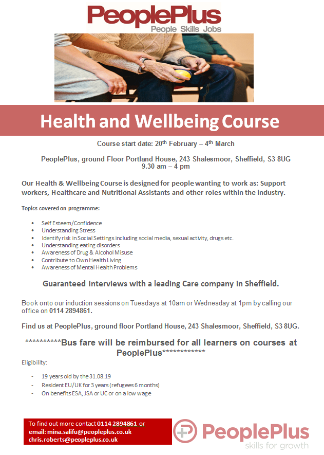PeoplePlus Academy is running a two-week Health and Wellbeing Course for people seeking employment within the healthcare sector.