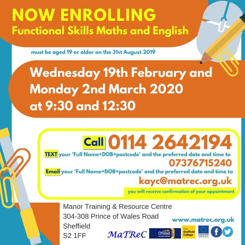 Manor Training and Resource Centre (MaTReC) is now enrolling for Maths and English Functional Skills students.