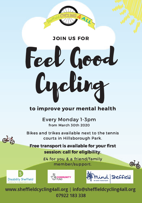 Sheffield Mind is also launching a weekly Feel Good cycling group on Monday 30 March 1-3pm at Hillsborough Park which will be co-created with participants. There will be a consultation at the first meeting to find out what people want from the group.
