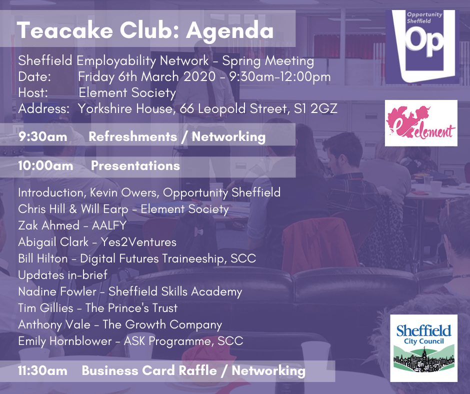 Agenda for Teacake Club meeting (Friday 6 March) Opportunity Opportunity Sheffield, Teacake Club meetings March 5, 2020 1 Minute Please see below for the agenda for tomorrow’s Teacake Club meeting at Element Society: Share this: Click to share on X (Opens in new window) X Click to share on Facebook (Opens in new window) Facebook Like Loading... Related Published March 5, 2020