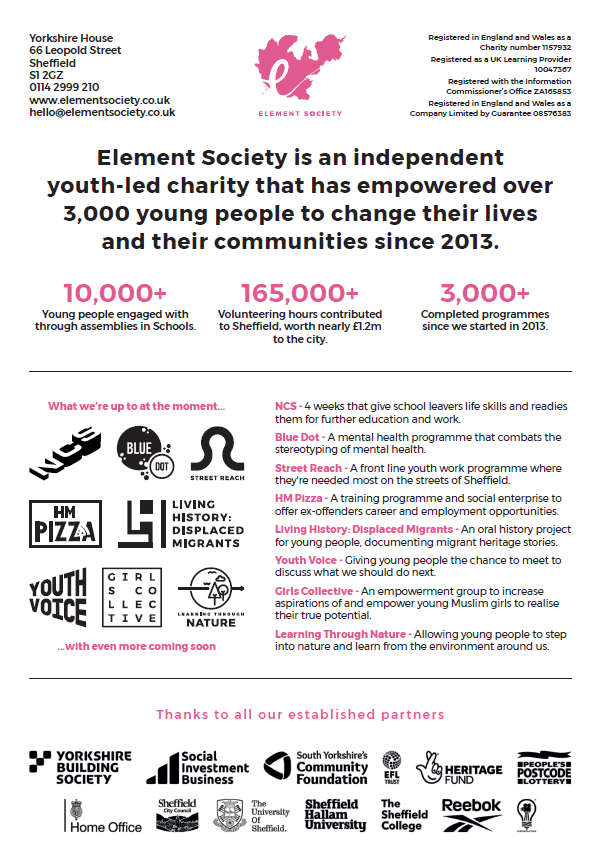 Element Society is an independent youth-led charity, based in the centre of Sheffield on Leopold Street.