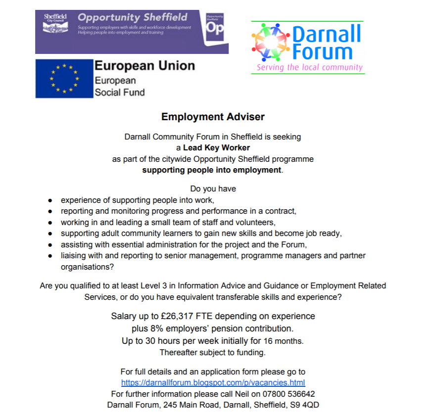 Darnall Forum is advertising for an Employment Adviser to work as a Lead Keyworker on the ESF Pathways employment support programme.