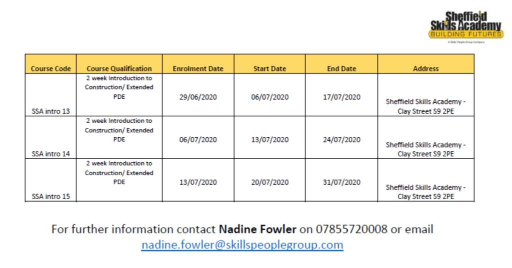 Sheffield Skills Academy is re-opening on Monday 6 July 2020 to deliver a 2-week introduction to construction programme.