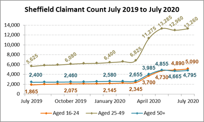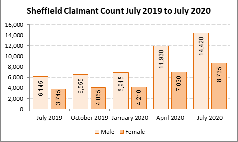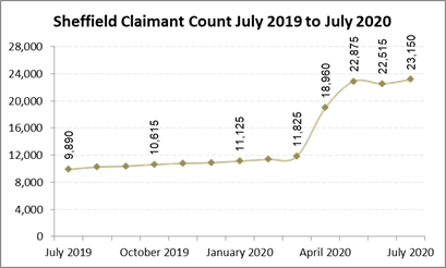 The claimant count in Sheffield more than doubled between February and May 2020 from 11,380 to 22,875, fell slightly in June to 22,515 and rose again in July to 23,150.