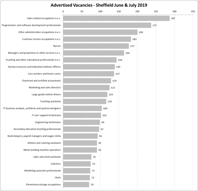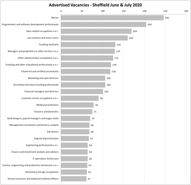 The 2 charts below compare vacancies advertised in June and July 2019 with those advertised over the same period in 2020[1]. The impact of Covid 19 on demand and the types of jobs recruited to is clear; 7,328 vacancies were advertised in June July 2019, 5,463 were advertised over the same period in 2020 and nurses aare now the most recruited to occupation.