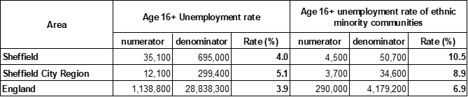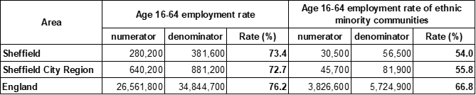 The APS also provides analysis of the same labour market measures as reflected in ethnic minority communities (non white British). The survey highlights the level of disadvantage faced by members of ethnic minority communities in the labour market relative to the population as a whole. In Sheffield, the City Region and nationally, working age members of ethnic minority communities are less likely to be economically active, less likely to be employed and more likely to be unemployed than the working age population as a whole.