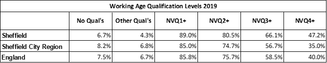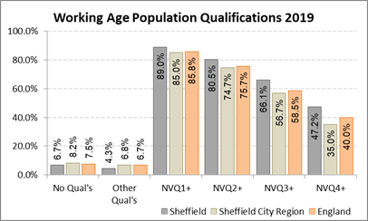The working age population of Sheffield is notably more highly qualified than regional and national averages at NVQ level 2 and above, level 3 and above and level 4 and above. There are also fewer people without qualifications. The high proportions of Sheffield residents with higher level (Level 3+) qualifications is attributable in part to the presence of 2 large and successful universities in the city, but also reflects the large numbers of managerial, professional, and associate professional and technical jobs in the city which make up 54.5% of the workforce.