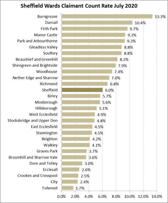 There are wide variations in the numbers of people claiming benefits because they are out of work in different parts of Sheffield. Measured at electoral ward level, Burngreave ward the area with the highest number of claimants has almost exactly 10 times as many people claiming as Fulwood ward, the area with the lowest number.