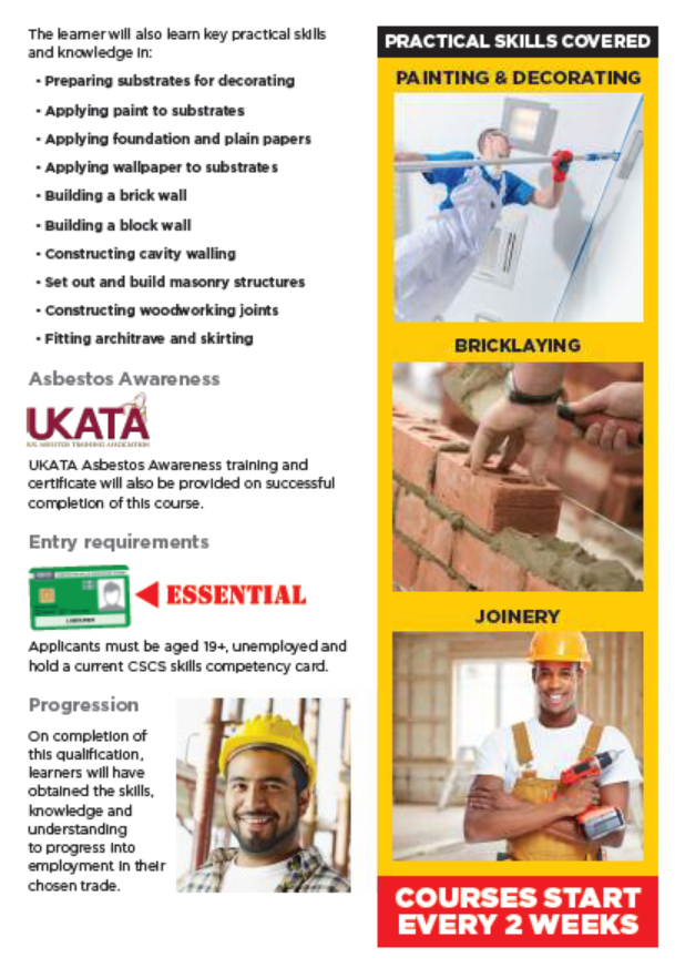 By attending this course you will gain valuable skills and be able to demonstrate to prospective employers that you are committed to working in this important sector of the economy. You will also gain a CSCS card which is vital to be able to work on a UK construction site.