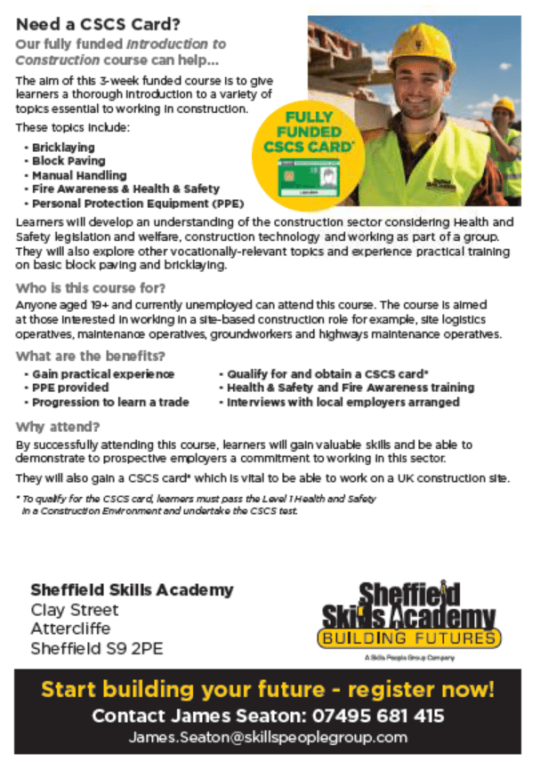 Sheffield Skills Academy is recruiting for its Level 1 Construction Multi-Trades course – a funded, seven week funded introduction to the industry covering joinery, bricklaying and painting & decorating.