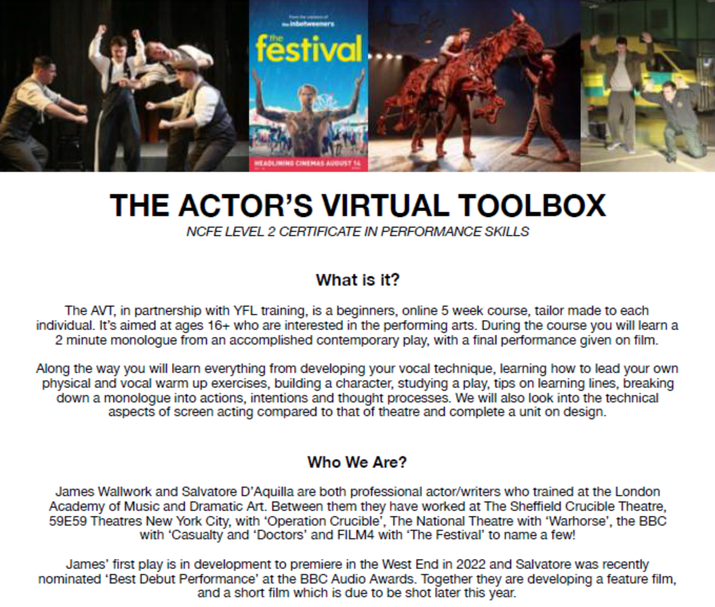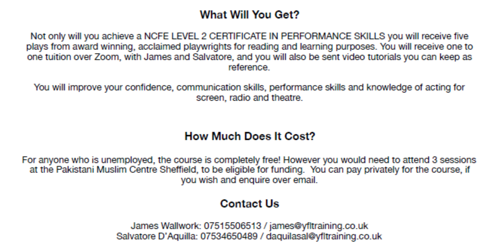 Professional actors James Wallwork and Salvatore DAquila have designed and delivered successfully a course in the performing arts and now have funding from the government to carry this on in Sheffield.
