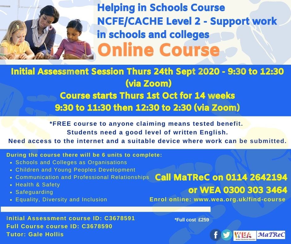 MaTReC has places available on a Helping in Schools Course NCFE/CACHE Level 2 for 14 weeks from Thursday 1 October.