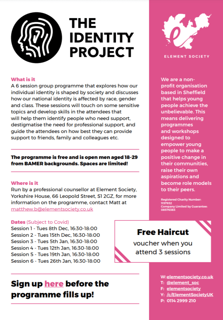 A 6 session group programme that explores how our individual identity is shaped by society, and discusses how our national identity is affected by race, gender and class, with advice and discussions on how we can best support people who are struggling with these issues. The programme is free and is open men aged 18-29 from BAMER backgrounds.