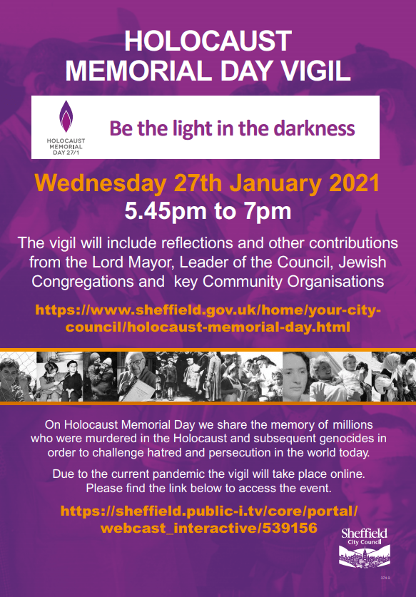 On Holocaust Memorial Day we share the memory of millions who were murdered in the Holocaust and subsequent genocides in order to challenge hatred and persecution in the world today. The theme this year is ‘BE THE LIGHT IN THE DARKNESS’ where there will be readings and reflections from the Lord Mayor, Leader of the Council and Community Organisations.