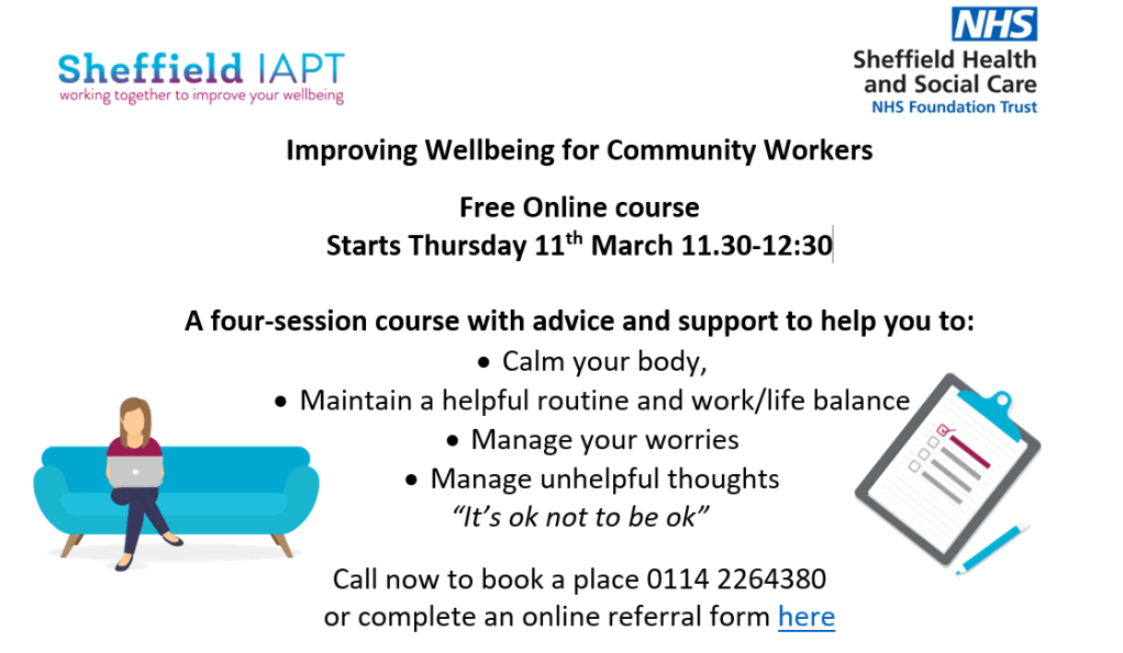 Sheffield IAPT is running a free, four session course on improving wellbeing for community workers.