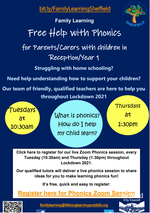 Our 30 minute Zoom phonics sessions run every Tuesday (10:30am) and Thursday (1:30pm) during January and February 2021.