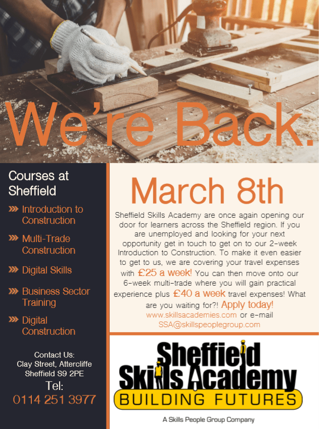 Sheffield Skills Academy is reopening from 8 March offering the 2 week Introduction to Construction course for the unemployed, followed by a 6 week multi-trade course with travel expenses paid. Please see below for more information –