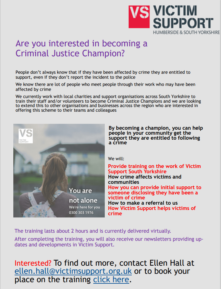 Victim Support Humberside & South Yorkshire is seeking Criminal Justice Champions to help ensure people receive the support they are entitled to following a crime.