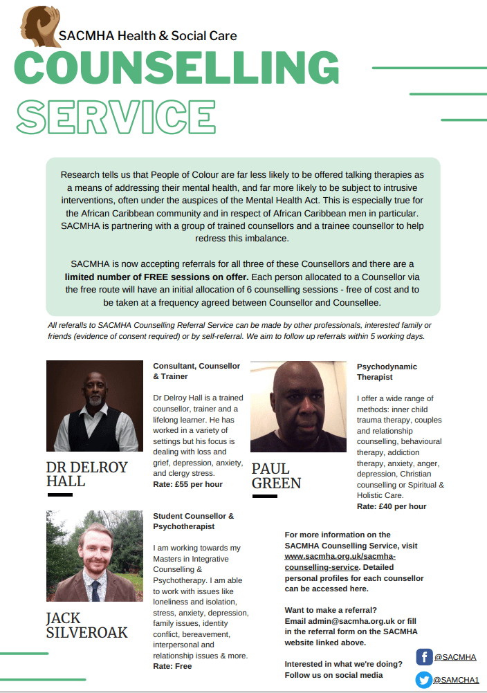 SACMHA offers a counselling service for members of Sheffield’s African Caribbean community – you can find out about it by reading below: