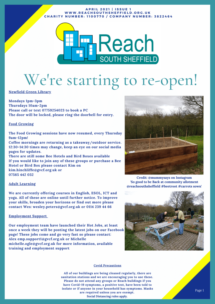 Reach South Sheffield – April Newsletter Opportunity Reach April 19, 2021 1 Minute Share this: Share on X (Opens in new window) X Share on Facebook (Opens in new window) Facebook Like Loading... Related Published April 19, 2021