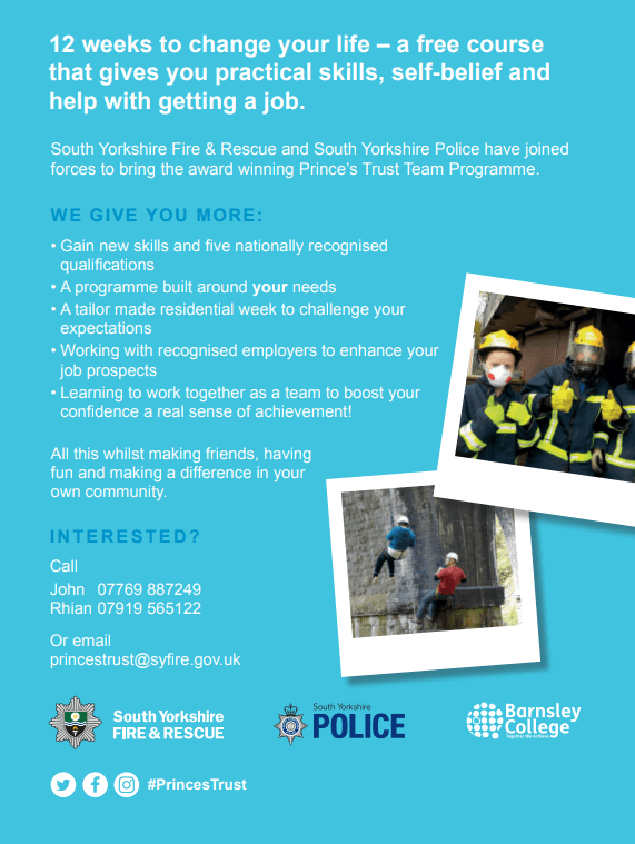 South Yorkshire Fire & Rescue and South Yorkshire Police have teamed up with the Prince’s Trust and Barnsley College to deliver our award winning 12 week TEAM programme. The course is open to 16 – 25 year olds and is a life changing 12 week adventure.