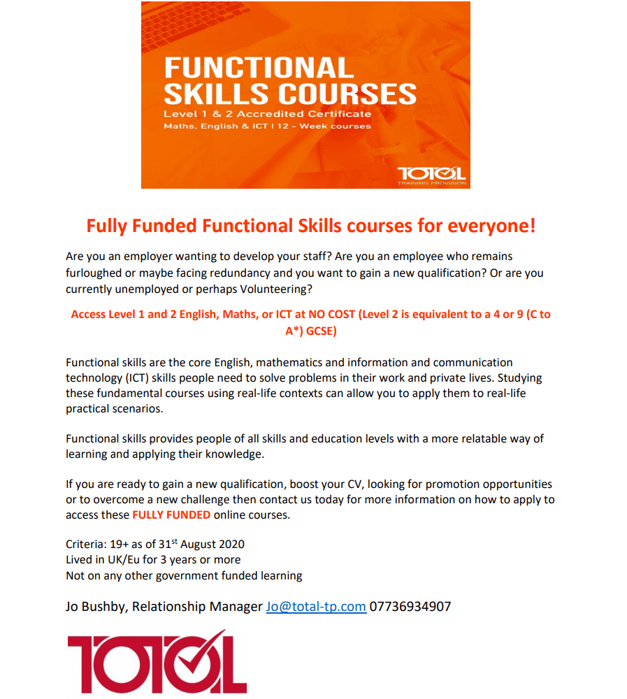 Functional Skills courses available with Total Training Provision Opportunity Total Training Provision April 26, 2021 1 Minute Share this: Click to share on X (Opens in new window) X Click to share on Facebook (Opens in new window) Facebook Like Loading... Related Published April 26, 2021