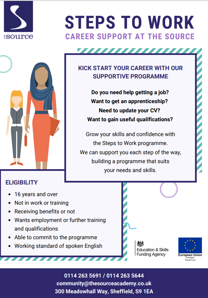 Steps to Work Career Support at The Source for 16+ unemployed Opportunity The Source April 27, 2021 1 Minute Share this: Click to share on X (Opens in new window) X Click to share on Facebook (Opens in new window) Facebook Like Loading... Related Published April 27, 2021