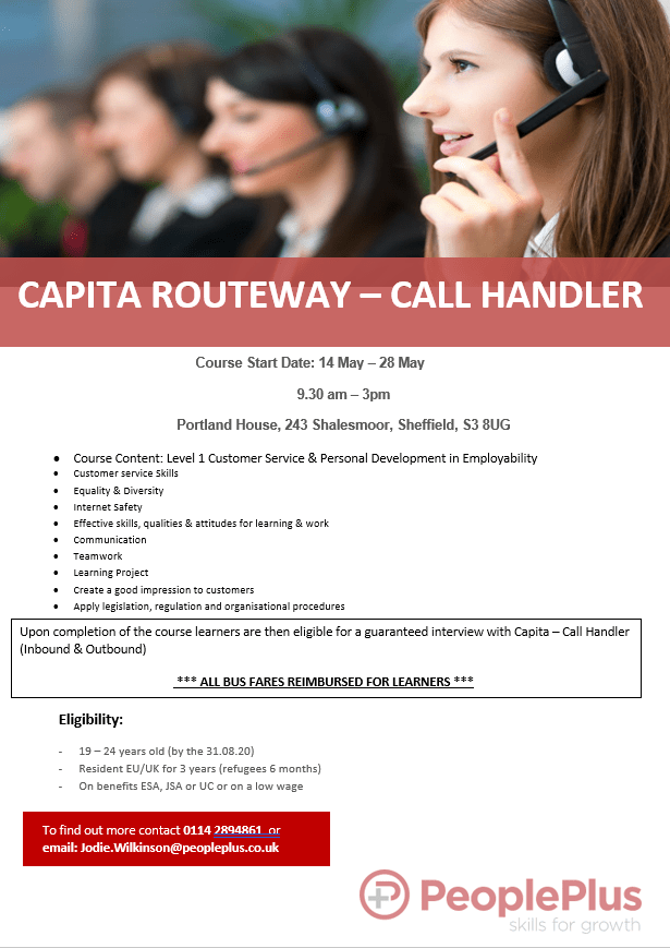 PeoplePlus Academy is running a two-week Call Handler routeway with guaranteed interviews for customer service jobs at Capita.