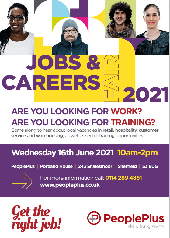 PeoplePlus is to stage a Jobs Fair on Wednesday 16 June, 10am – 2pm at Portland House, 243 Shalesmoor, Sheffield, S3 8UG.