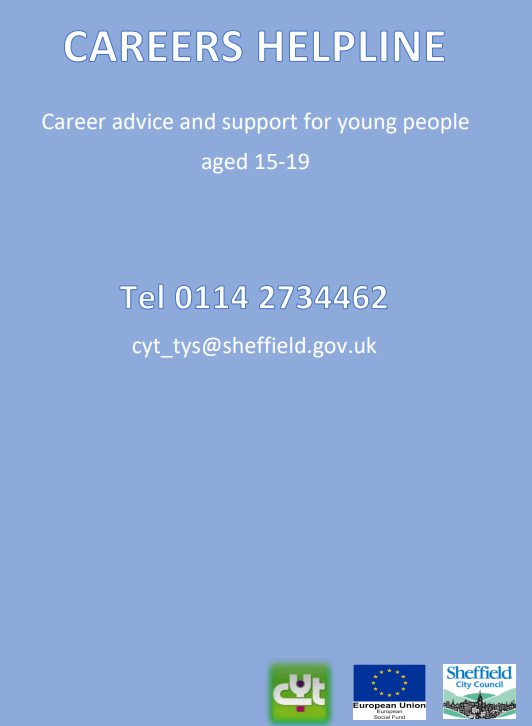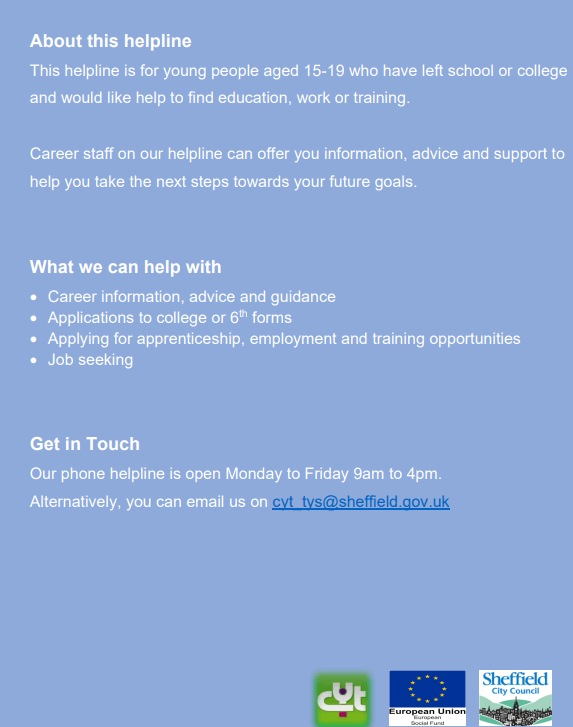 SCC Community Youth Team: Careers Helpline for 15 – 19 year olds Opportunity Sheffield City Council June 4, 2021June 4, 2021 1 Minute An informative Helpline for school OR college leavers which offers guidance into education, training & employment. Share this: Click to share on X (Opens in new window) X Click to share on Facebook (Opens in new window) Facebook Like Loading... Related Published June 4, 2021June 4, 2021