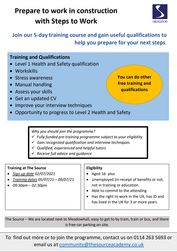 The Source is offering a five-day pre-training course for the construction industry, featuring Level 1 Health and Safety. For more information, see below: