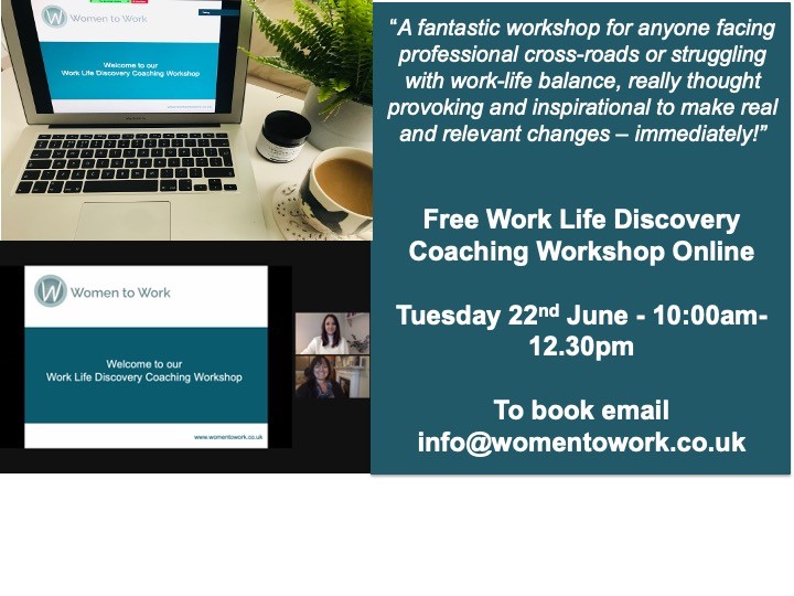 For more information or to book your place email info@womentowork.co.uk or visit https://www.womentowork.co.uk/homepage/women/work_life_discovery_coaching_workshop/